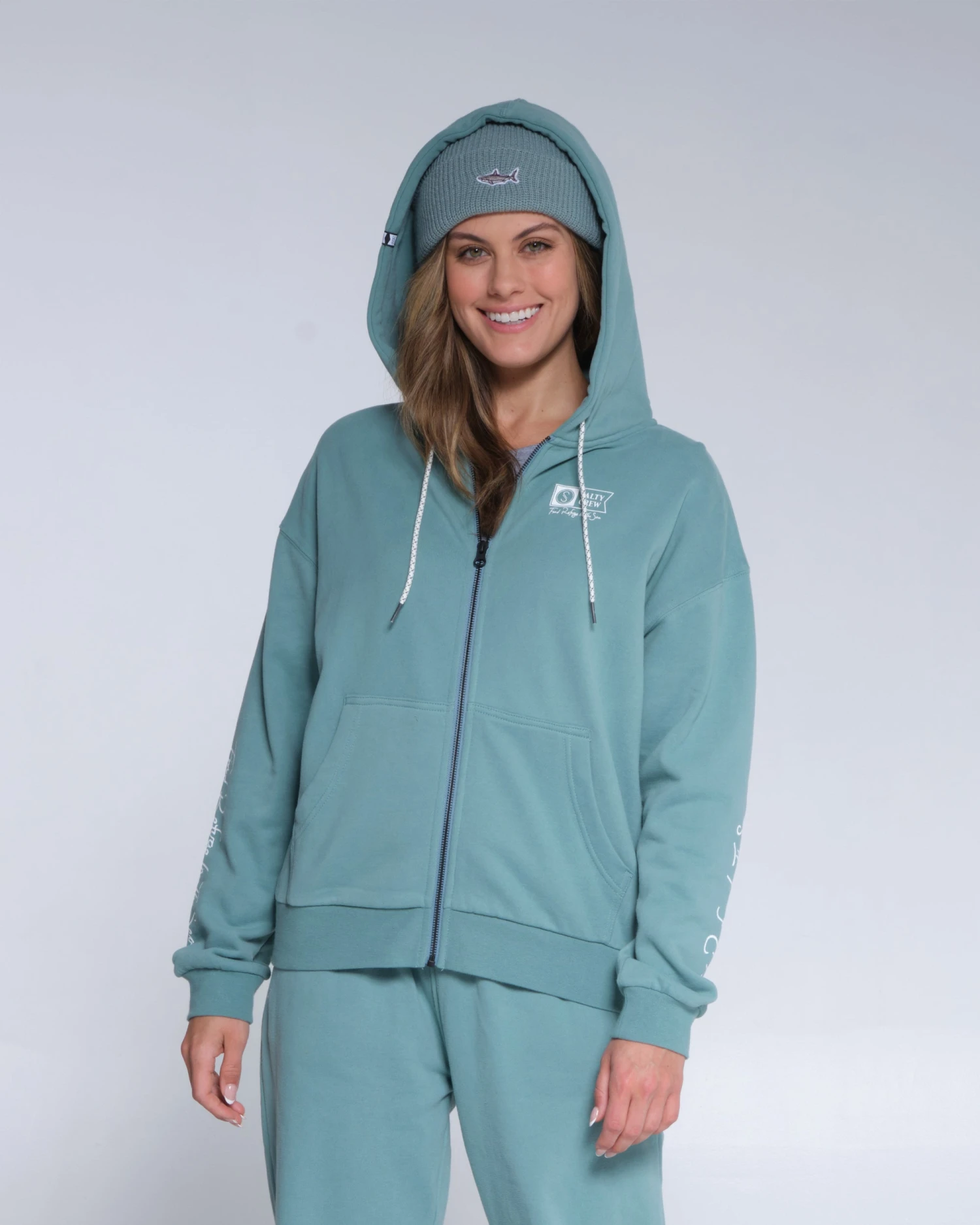 Salty Crew clamp label at hood