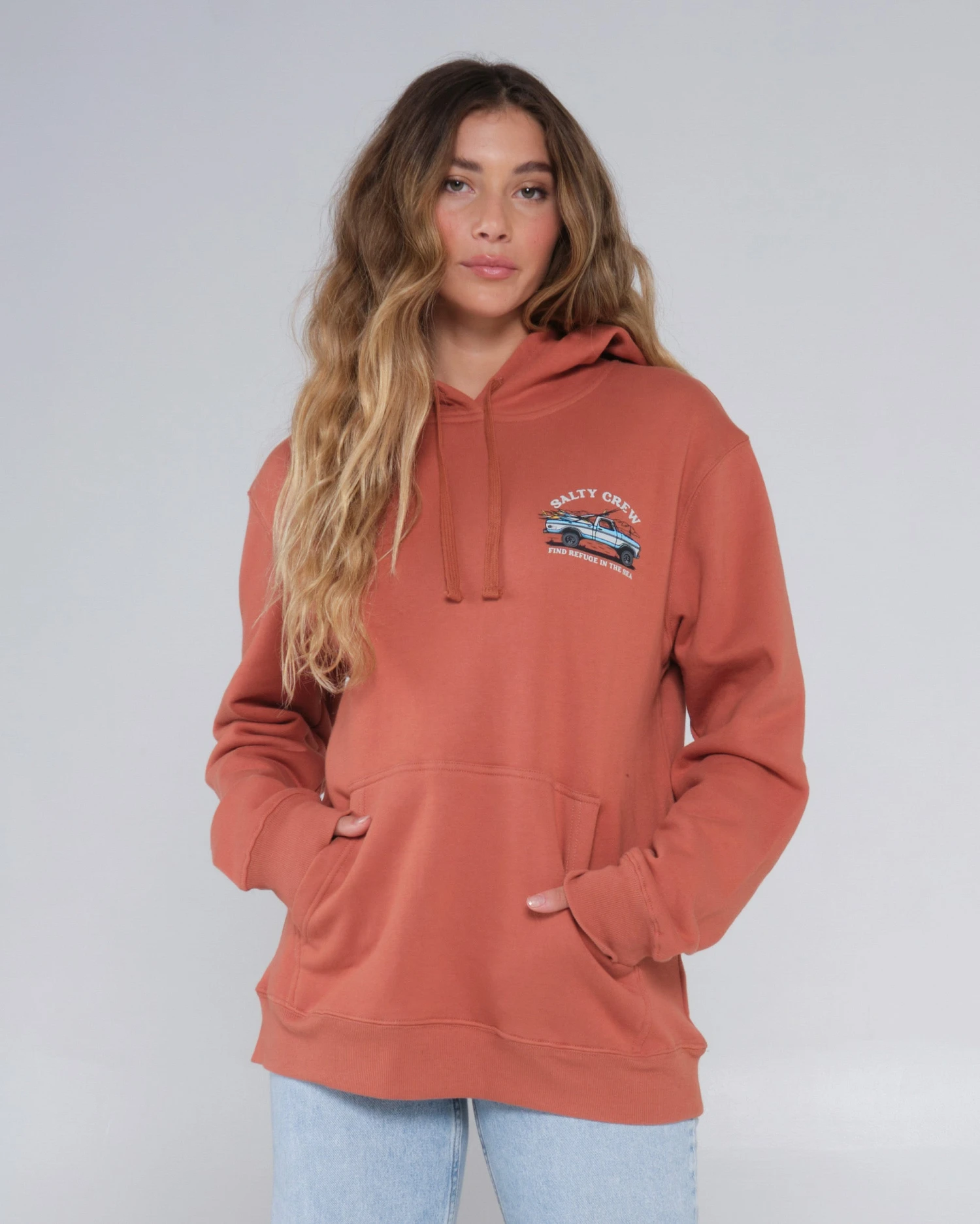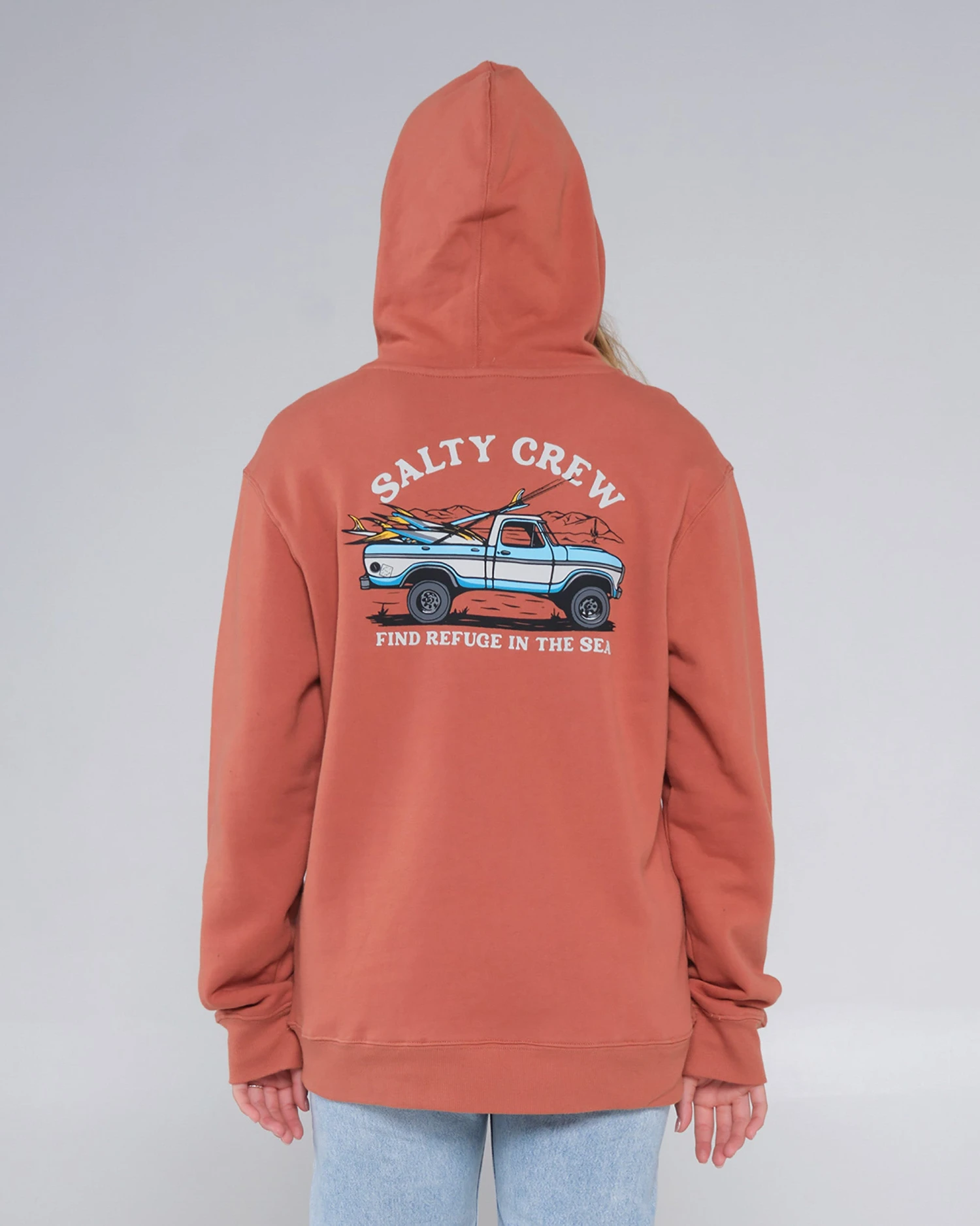 Salty Crew clamp label at hood