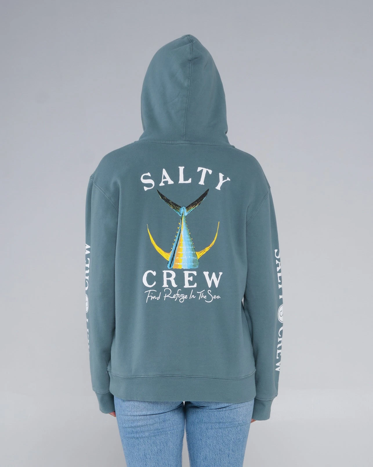 Salty Crew clamp label at hood